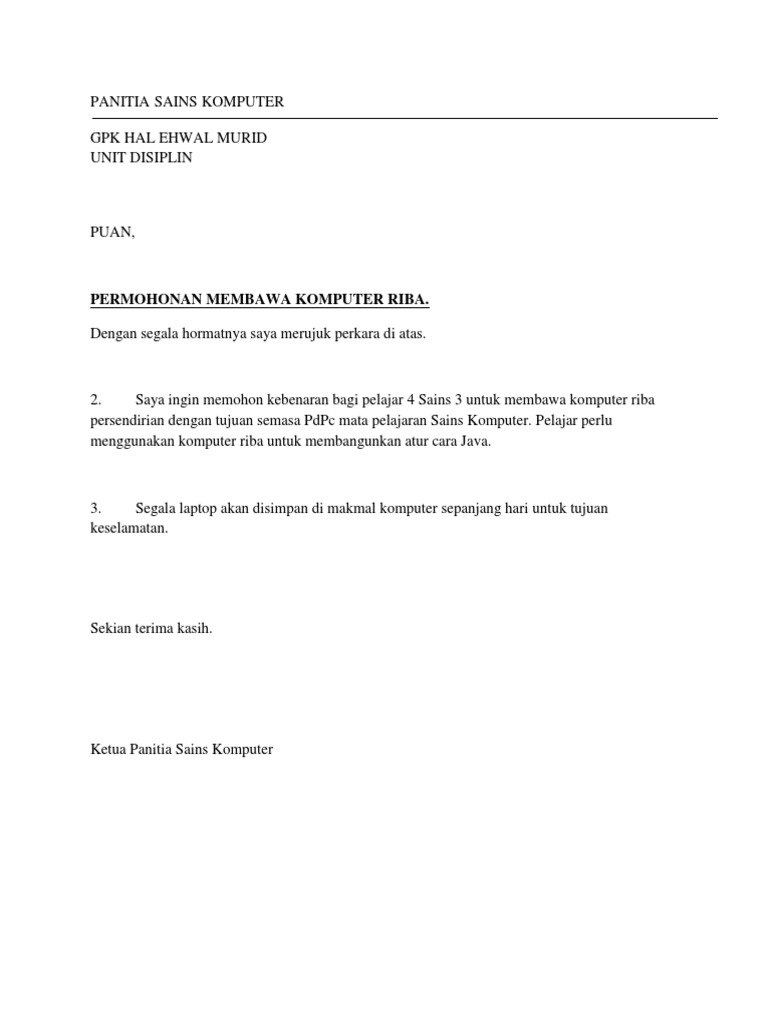 Contoh Surat Permohonan Ingin Membawa Komputer Riba Ke Sekolah